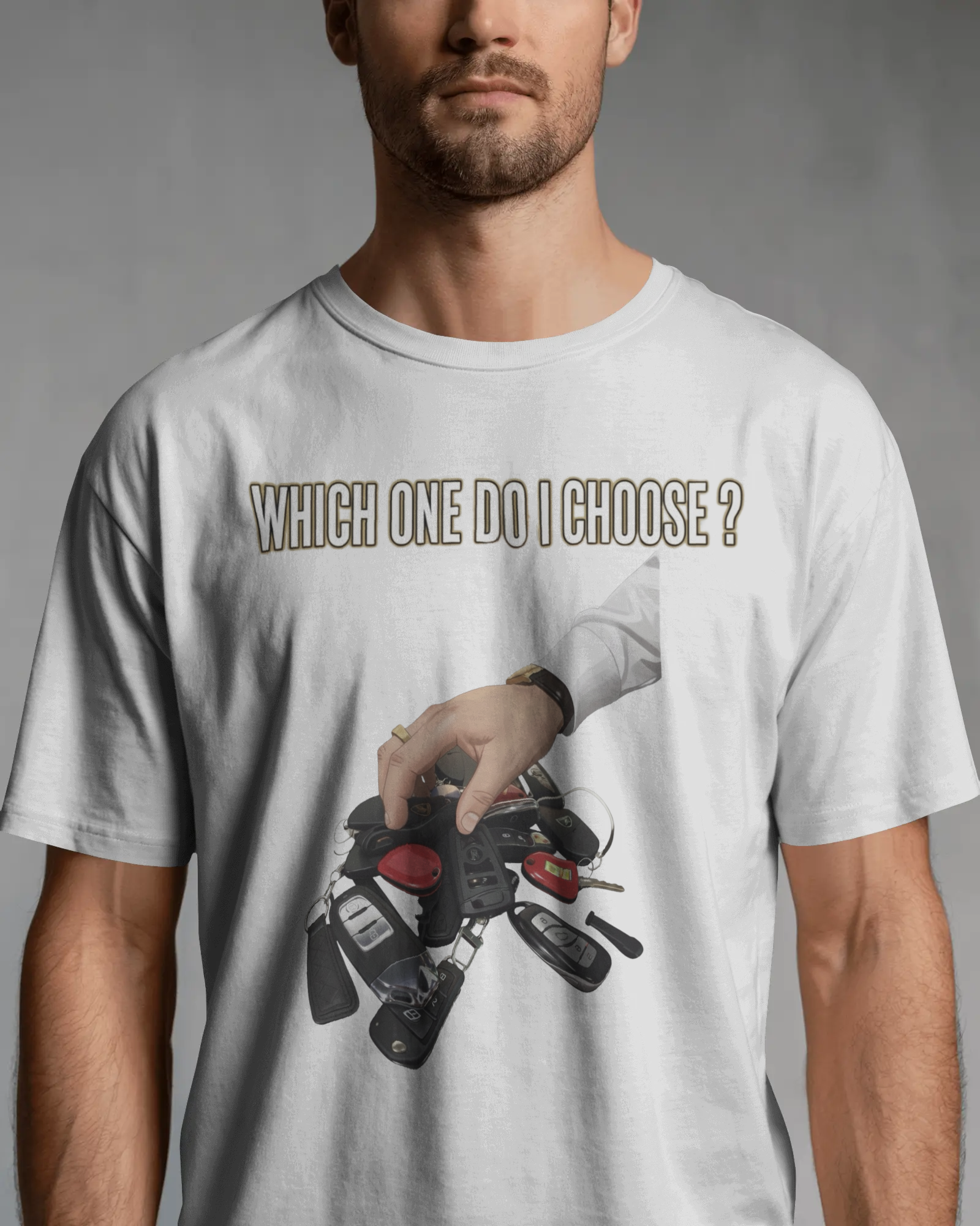 Visual Dominance: High-definition DTG (Direct-to-Garment) print featuring the "Which One Do I Choose?" luxury key artwork.